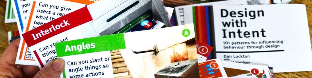 Design with Intent ToolkitThis design toolkit does aim to specifically address issues around sustainable behaviour choices. It comes as a series of cards, each showing a design intervention aimed to force or encourage sustainable behaviour choices with a brief explanation on the psychological basis for each intervention. There is also a downloadable A3 workbook that outlines the methodology behind the toolkit and how to use the toolkit.