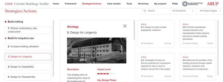 Arup developed a Circular Building Toolkit with the Ellen MacArthur Foundation. I’ve taken a quick look at it but haven’t assessed it in depth. It’s a web based tool that seems to work similar to a decision tree, in that your answer to posed questions directs you to different circular design strategies. It’s a very easy-to-use and comprehensive tool, which I think is ideal for practitioners and practices looking to develop their understanding and use of circular design principles on project.